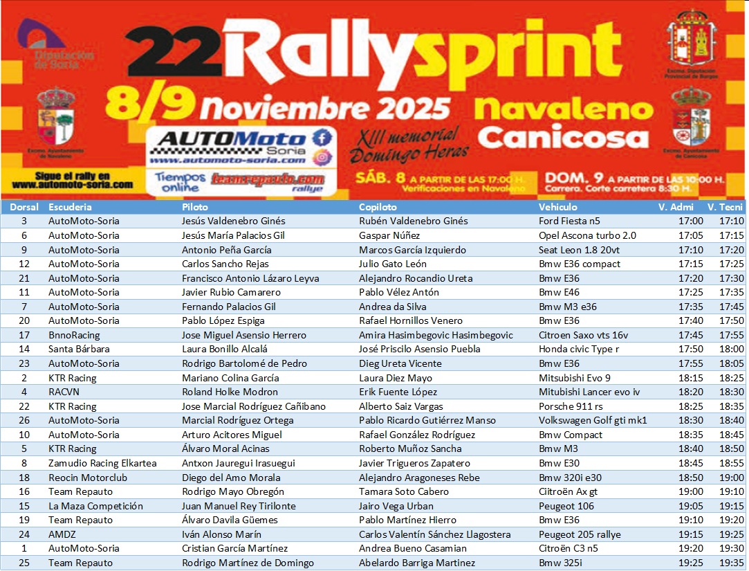 Los días 8 y 9 de Noviembre de 2025 XXII Rallysprint Navaleno-Canicosa XIII Memorial Domingo Heras.